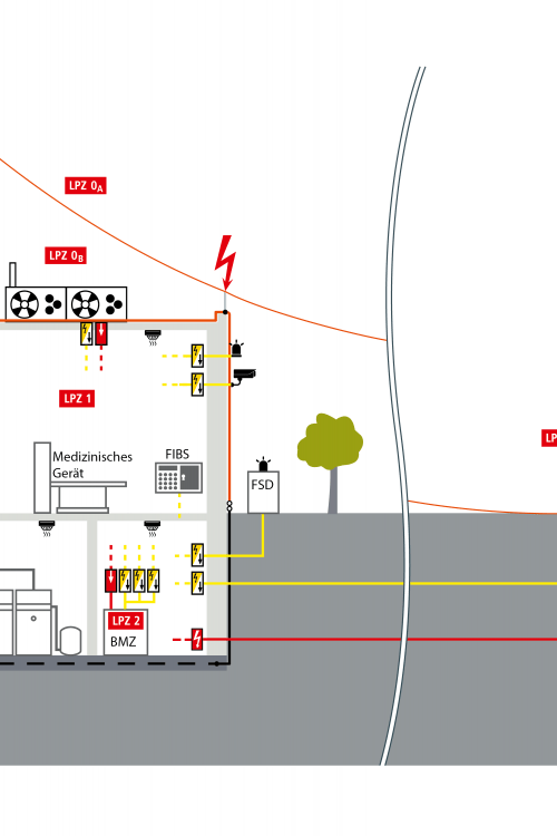 Der äußere Blitzschutz schützt zwar Personen und materielle Werte in den Gebäuden vor Brandgefahr, nicht aber die elektrischen und elektronischen Systeme vor Ausfall durch Überspannungen infolge der Blitzentladung. Wirksamen Schutz gegen Überspannungen, die durch den elektromagnetischen Blitzimpuls (LEMP) verursacht werden, beschreibt das Prinzip der Blitzschutzzonen (LPZ – Lightning Protection Zone) nach DIN EN 62305-4.